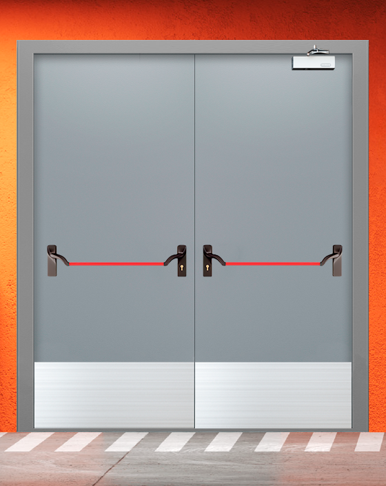 —Противопожарная двупольная серая дверь EI 30 (3-го типа) с ручкой антипаника, широким отбойником