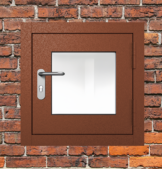 Высококачественное противопожарное оборудование - люк металлический коричневый с окном и блестящей ручкой промышленного класса для систем защиты объектов.