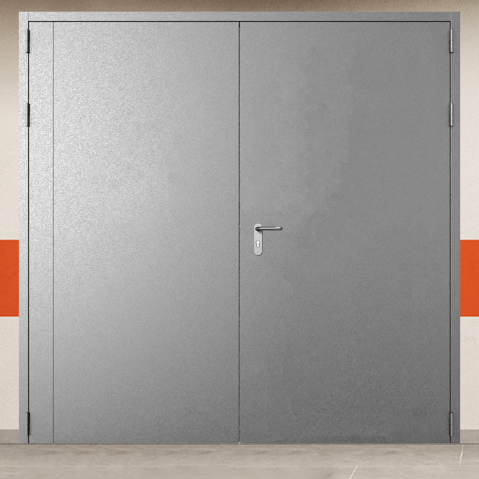 Специализированное решение ворота металлические двустворчатые серые с блестящей ручкой без доводчика для комплексного обеспечения требований пожарной безопасности.