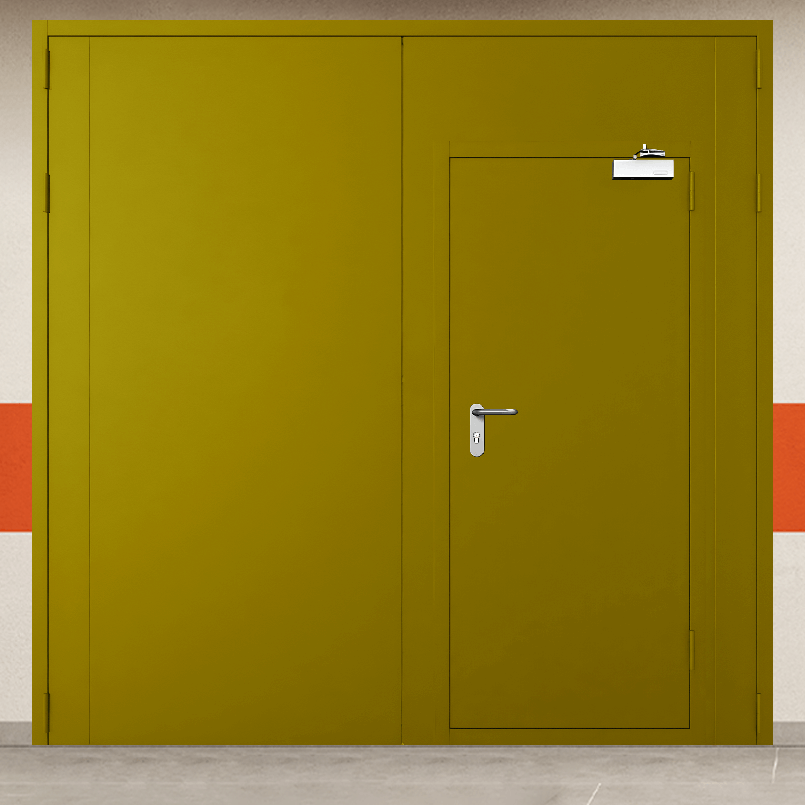 Профессиональное решение для обеспечения пожарной безопасности - ворота металлические двустворчатые желтые с дверью, блестящей ручкой с сертифицированными характеристиками надежности.