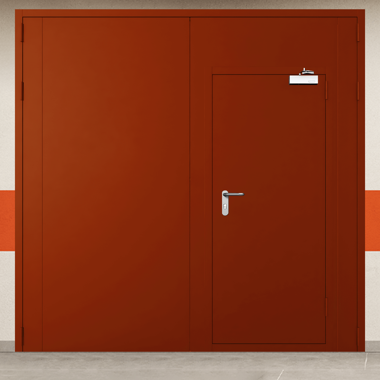 Противопожарные двустворчатые ворота с сигнальной красной окраской и автоматическим доводчиком.