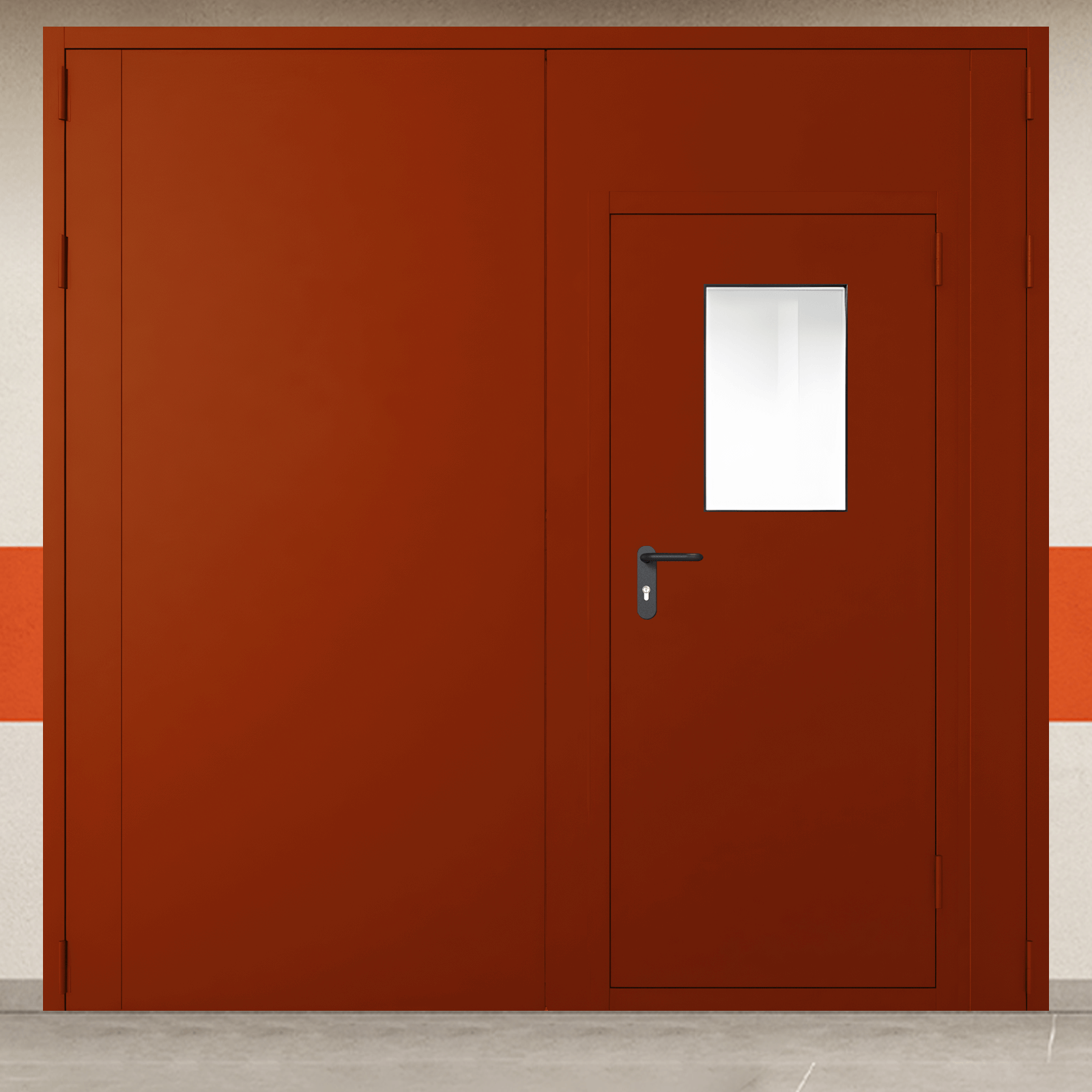 Высококачественное противопожарное оборудование - ворота металлические двустворчатые красные с дверью и окном, промышленного класса для систем защиты объектов.