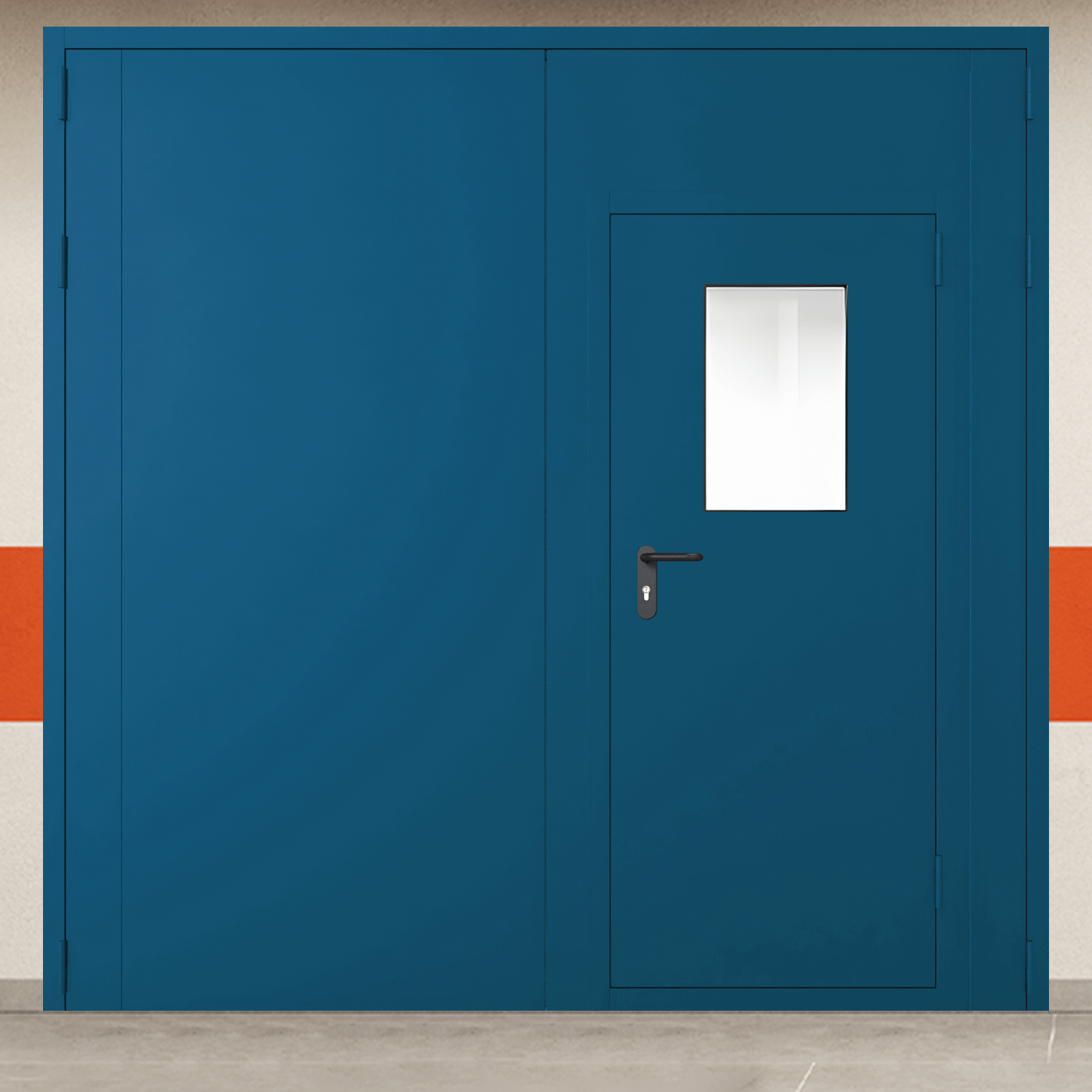 Высококачественное противопожарное оборудование - ворота металлические двустворчатые синие с дверью и окном, промышленного класса для систем защиты объектов.