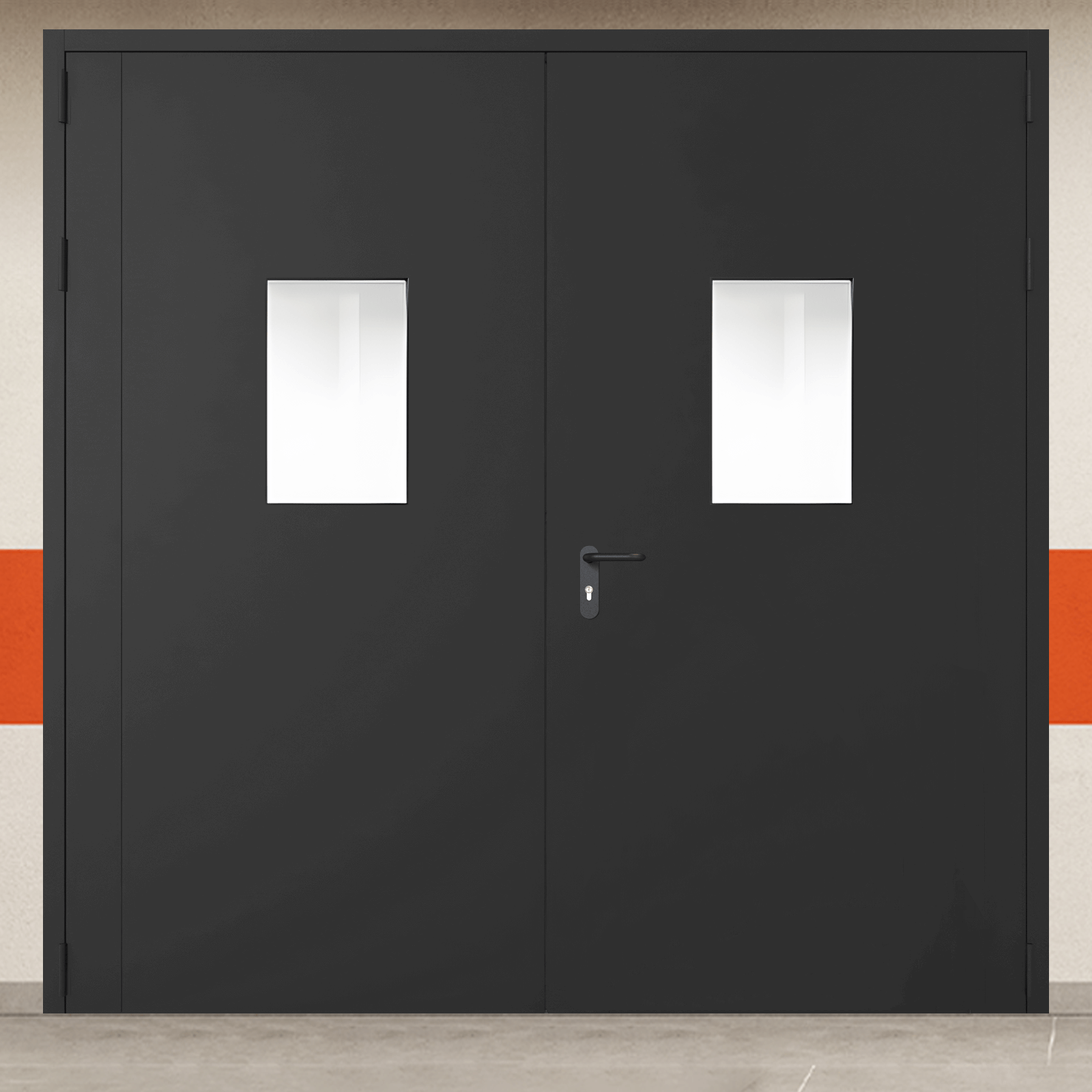 Профессиональное решение для обеспечения пожарной безопасности - ворота металлические двустворчатые черные с двумя окнами с сертифицированными характеристиками надежности.