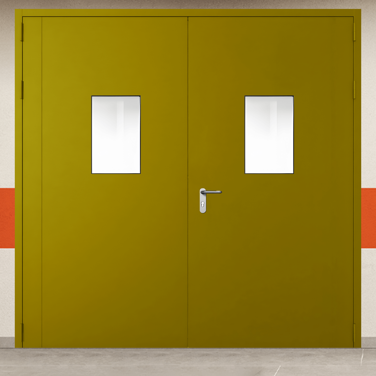 Высококачественное противопожарное оборудование - ворота металлические двустворчатые желтые с двумя окнами, блестящей ручкой промышленного класса для систем защиты объектов.