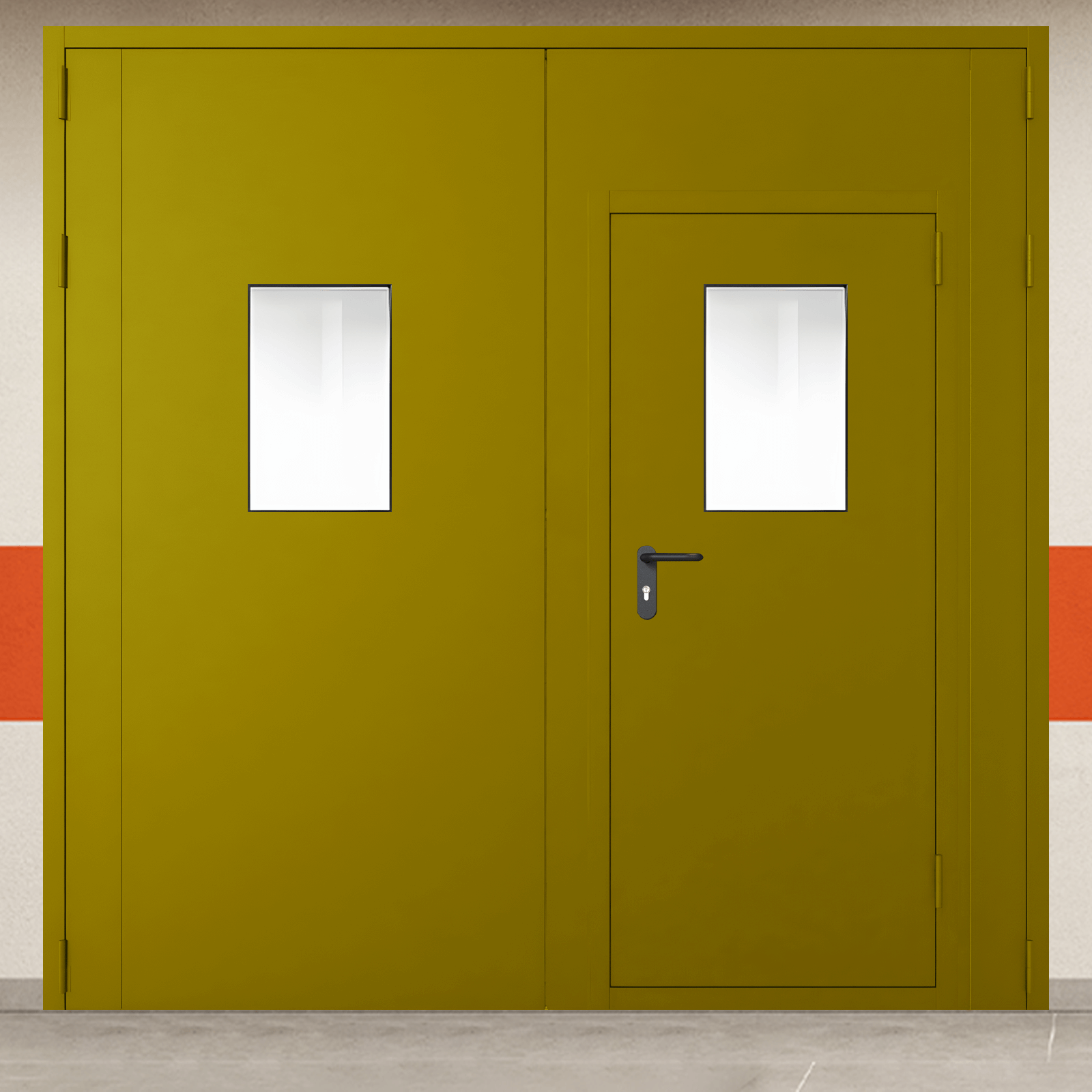 Профессиональное решение для обеспечения пожарной безопасности - ворота металлические двустворчатые желтые с дверью и двумя окнами с сертифицированными характеристиками надежности.