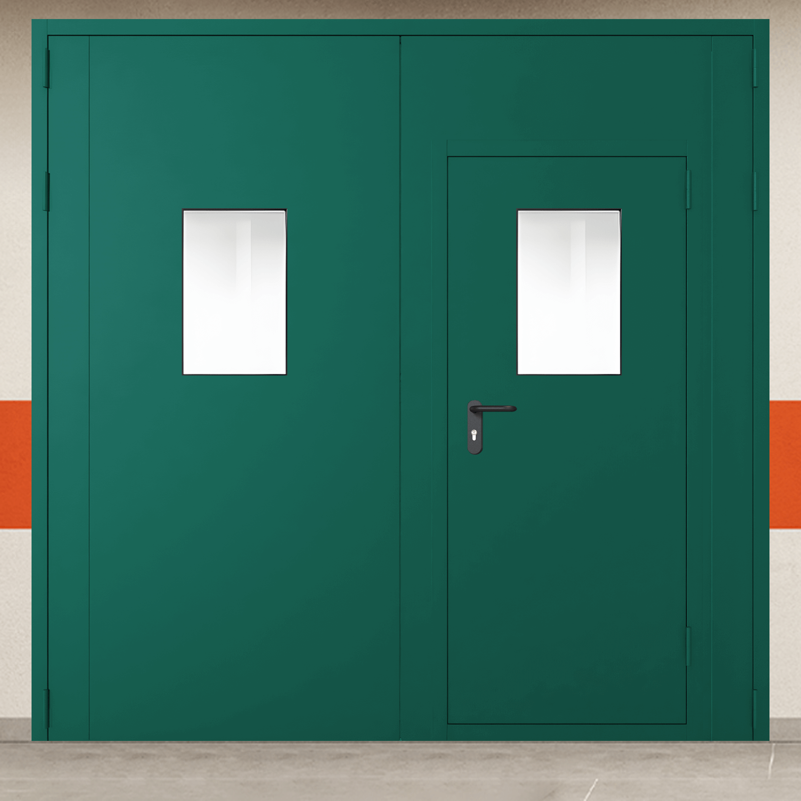 Профессиональное решение для обеспечения пожарной безопасности - ворота металлические двустворчатые зеленые с дверью и двумя окнами с сертифицированными характеристиками надежности.