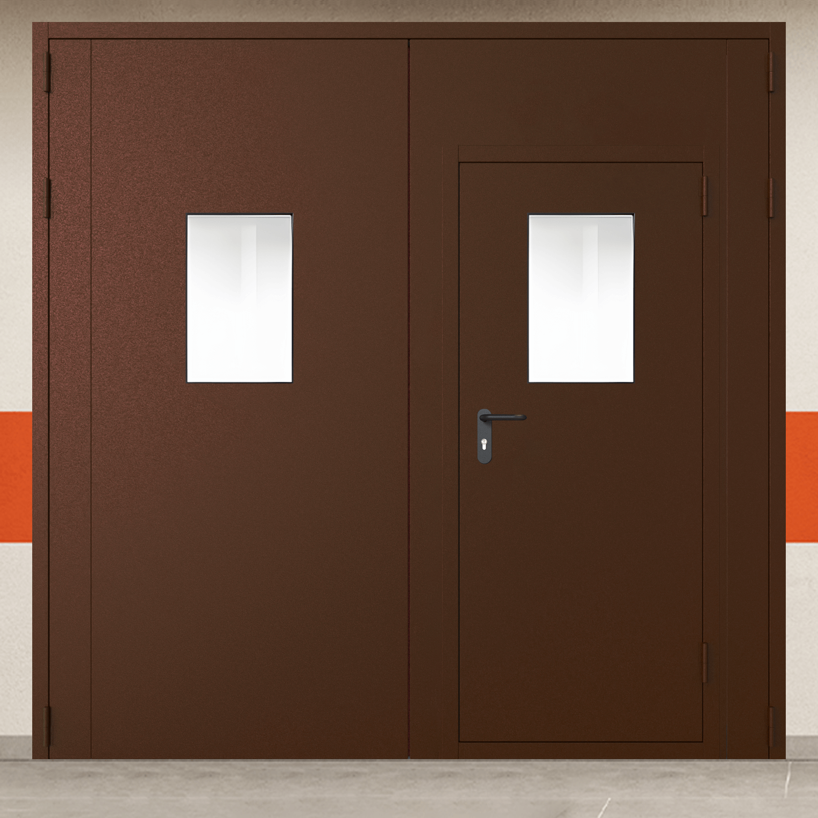 Сертифицированные ворота двустворчатые с дверью и двумя окнами для обеспечения безопасности эвакуационных путей.