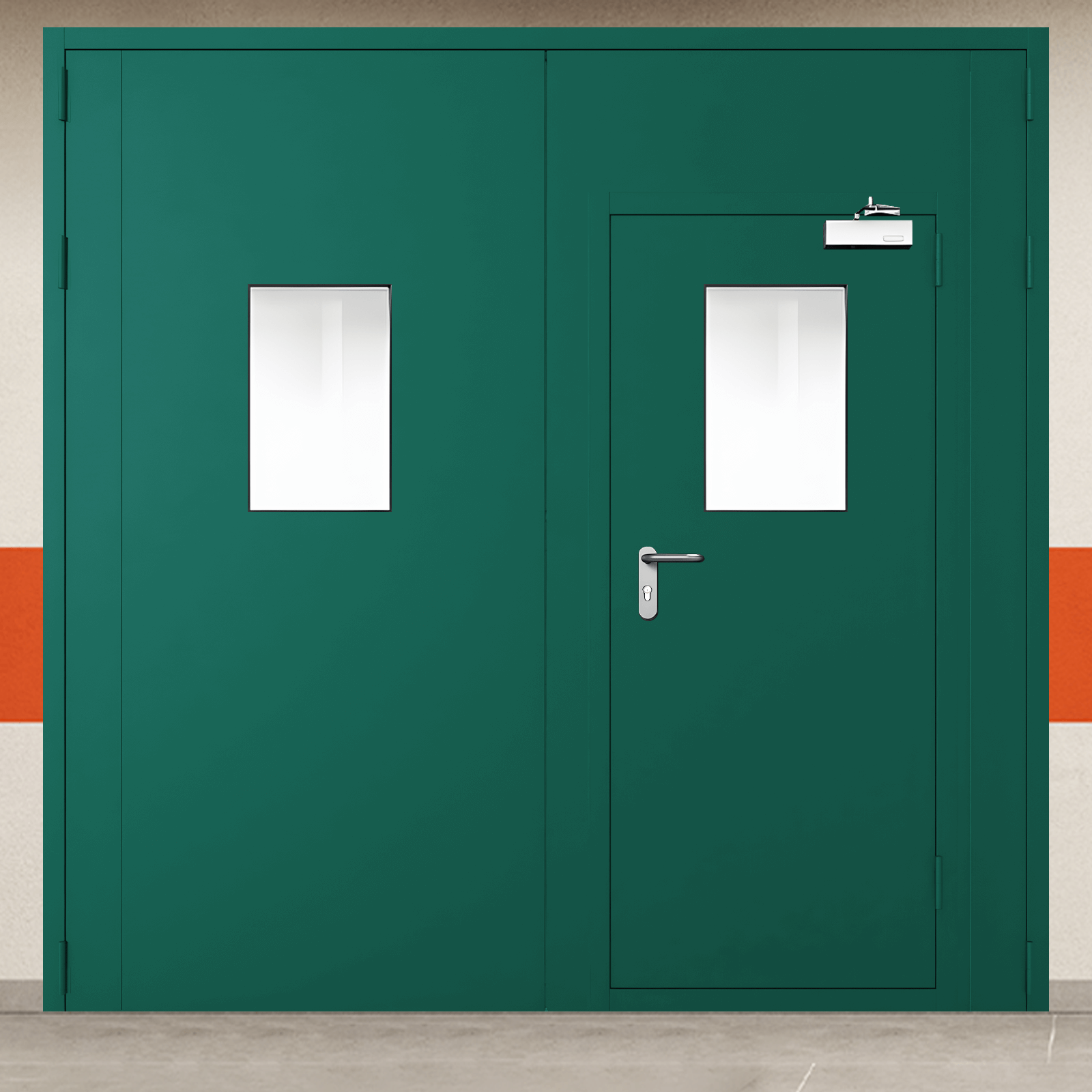 Высококачественное противопожарное оборудование - ворота металлические двустворчатые зеленые с двумя окнами, блестящей ручкой и доводчиком промышленного класса для систем защиты объектов.
